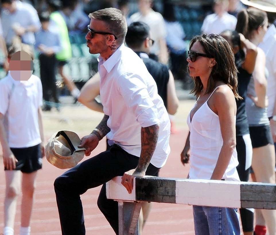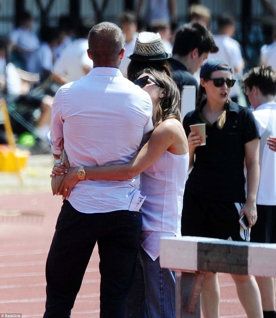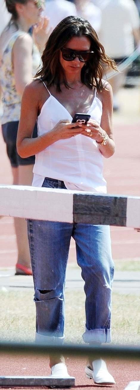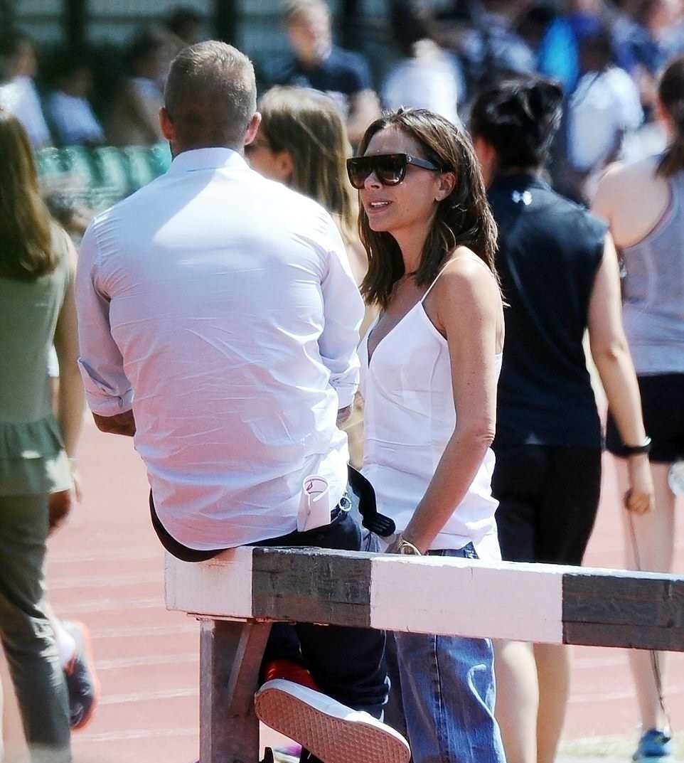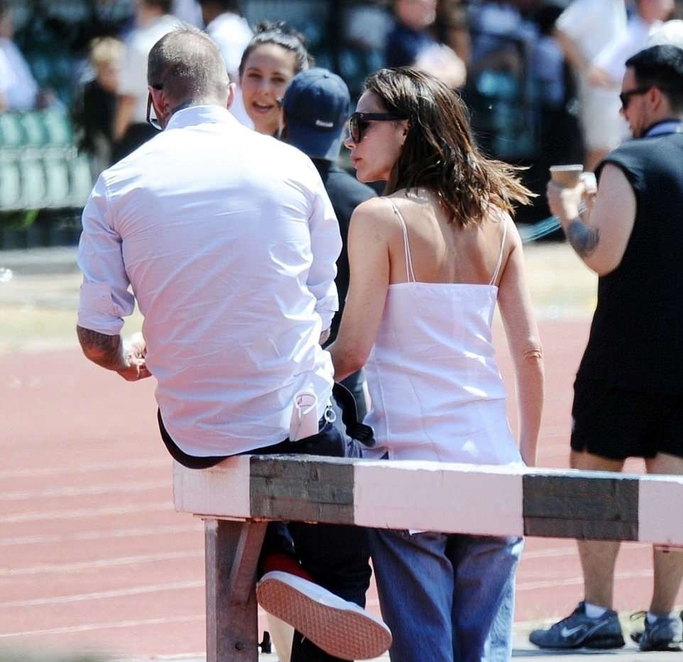 Το πρώην Spice Girl φορούσε ένα χαλαρό λευκό τοπ και ένα τζιν. Δεν δίστασε να πάρει αγκαλιά τον επί 19 χρόνια σύζυγό της μιας και είχαν επέτειο πρόσφατα.