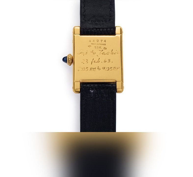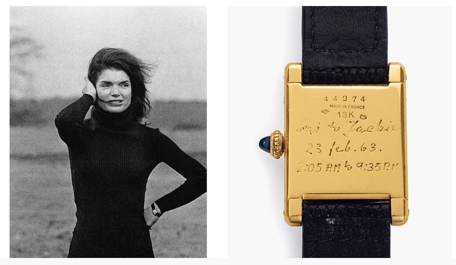 Το 18 καρατίων χρυσό ρολόι χειρός του οίκου Cartier, κατασκευής 1962, ήταν δώρο στη Jackie από το κουνιάδο της, πρίγκιπα Στάνισλαβ Ράτζιβιλ. Στο εσωτερικό του είναι χαραγμένη η ημερομηνία 23 Φεβρουαρίου 1963, που συμπωματικά είναι ακριβώς 9 μήνες πριν την δολοφονία του Kennedy.