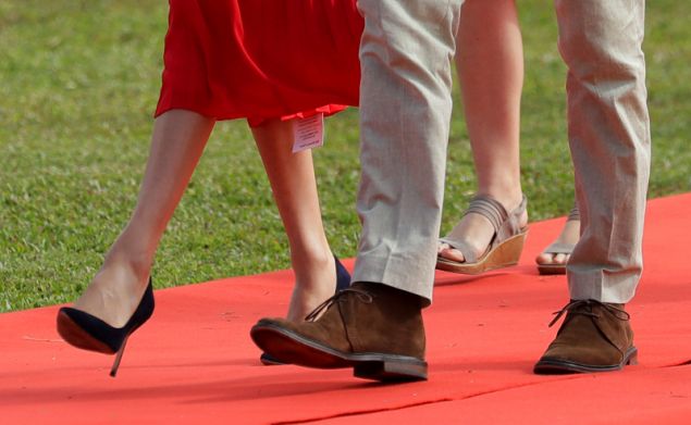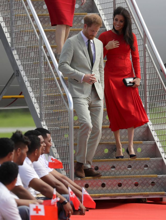 Η Markle φοράει ένα κατακκόκκινο φόρεμα από το οποίο κρέμεται το ταμπελάκι, πράγμα που φάνηκε ξεκάθαρα.