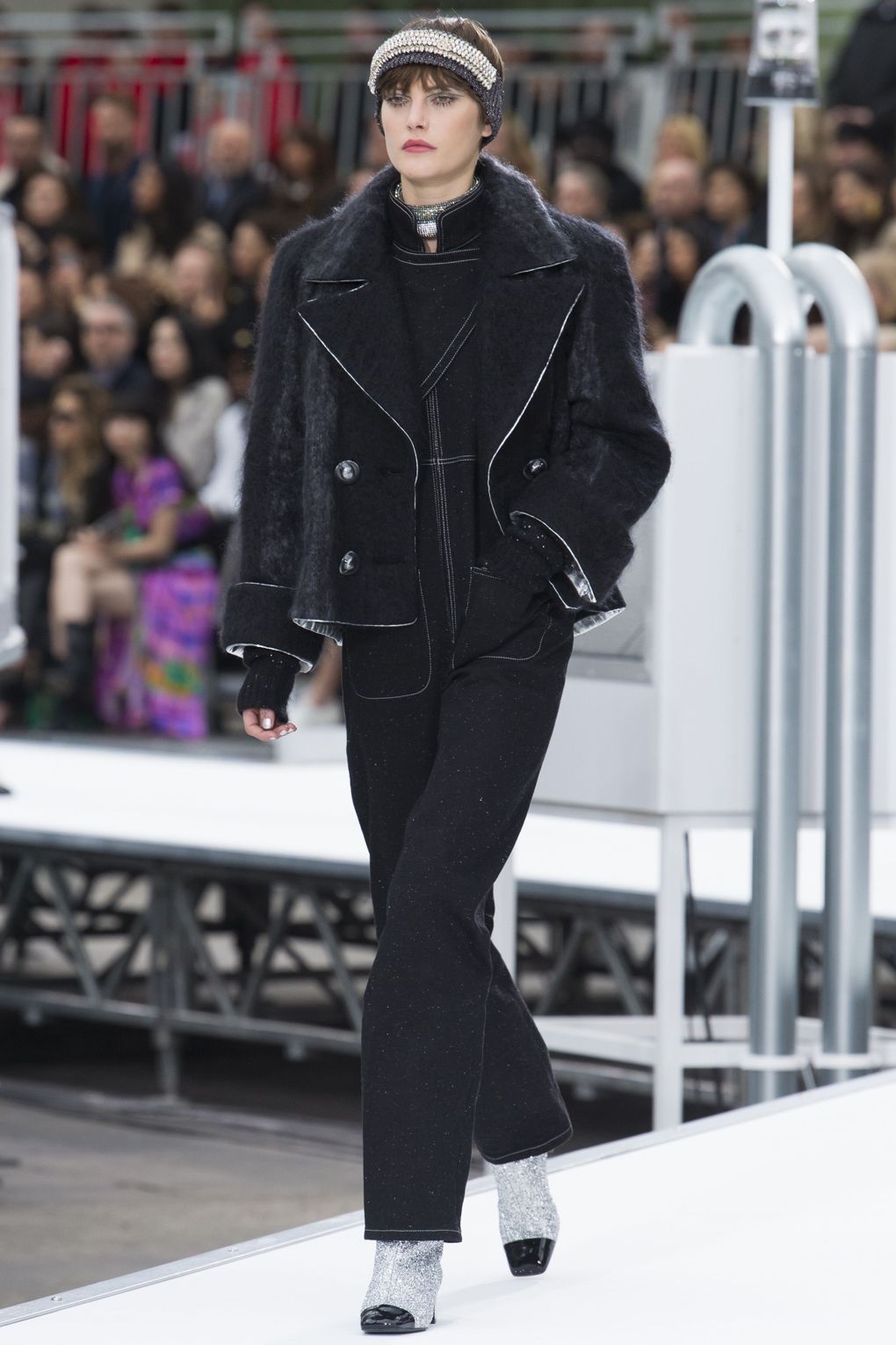 Μετά το αεροδρόμιο που άφησε εποχή και τον κόσμο της ψηφιακής πληροφορίας, το φετινό show ήταν… off to space με δημιουργίες από τον φουτουρισμό των space ages στα 60s σε ένα «only Chanel» αρμονικό δέσιμο με τη λάμψη και τα metallics των 80s. Mini και midi και γραμμή Α από τη μία, βάτες στους ώμους και στενή τονισμένη μέση από την άλλη.