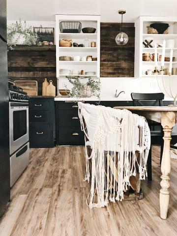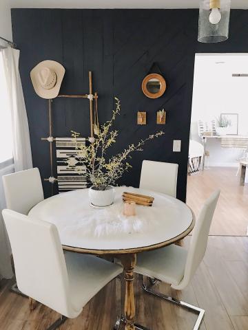 Στην τραπεζαρία η Kate έχει τοποθετήσει ένα vintage στρογγυλό τραπέζι και 4 πιο μοντέρνες καρέκλες, ενώ σε πολλά σημεία υπάρχουν ξύλινες μικρές σκάλες οι οποίες δίνουν ρουστίκ πινελιές στο χώρο.